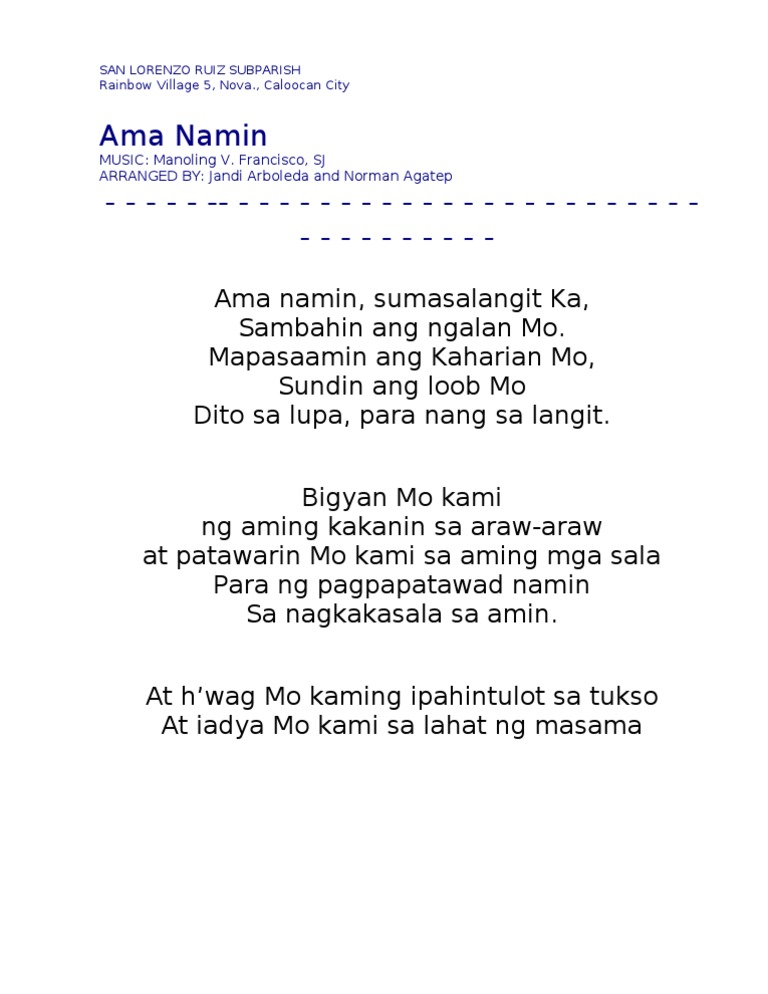 Rekisteröidy Deezeriin ja kuuntele Ama Namin Sapagkat SaYo Ang Kaharian esittäjältä Bukas Palad Music Ministry sekä 90 miljoonaa muuta kappaletta. Ama Namin Bukas Palad Music Ministry. Free Piano Sheet Music Browse All.