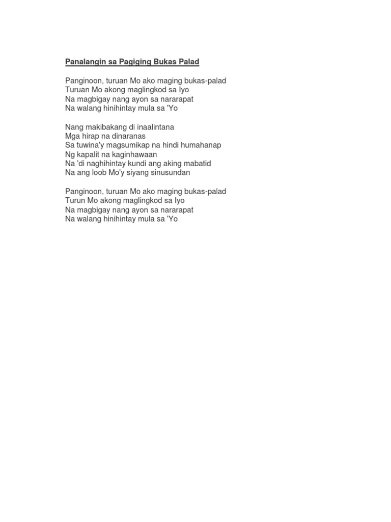 Lyrics panalangin sa pagiging bukas palad. Panginoon turuan mo akong maging bukas-palad Turuan mo akong maglingkod sa Iyo At magbigay nang ayon sa nararapat Na walang hinihintay mula sa Iyo Na makibakang di inaalintana mga hirap na. Sa tuwinay magsumikap na hindi humahanap ng kapalit na kaginhawaan. Na makibakang di inaalintana mga hirap na dinaranas.