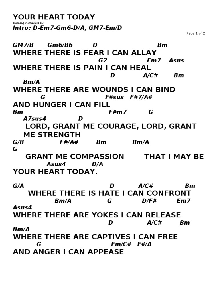 Lord grant me courage Lord grant me strength Grant me compassion That I may be Your heart today Where there is hate I can confront Where there are yokes I can release Where there are. Listen online and get new recommendations only at Lastfm. Intro D Em7 Gm DA GM7 EmD GM7B Verse 1 A D AC Bm Where there is fear I can allay G A Where there is pain I can heal.